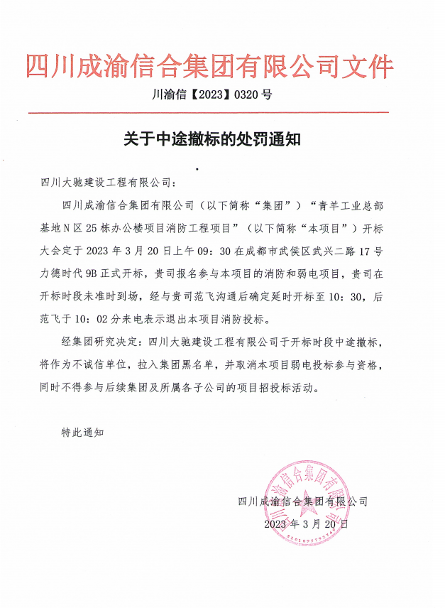 关于“四川大驰建设工程有限公司”中途撤标行为的处罚通知
