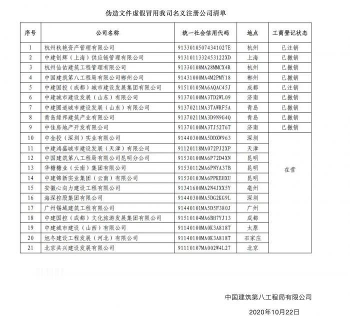 中建八局在发布上述公告的同时,还披露了一份伪造文件虚假冒用公司名义注册公司的清单,清单中共有21家“李鬼”公司,其中有2家已注销,7家已撤销,12家仍在营。